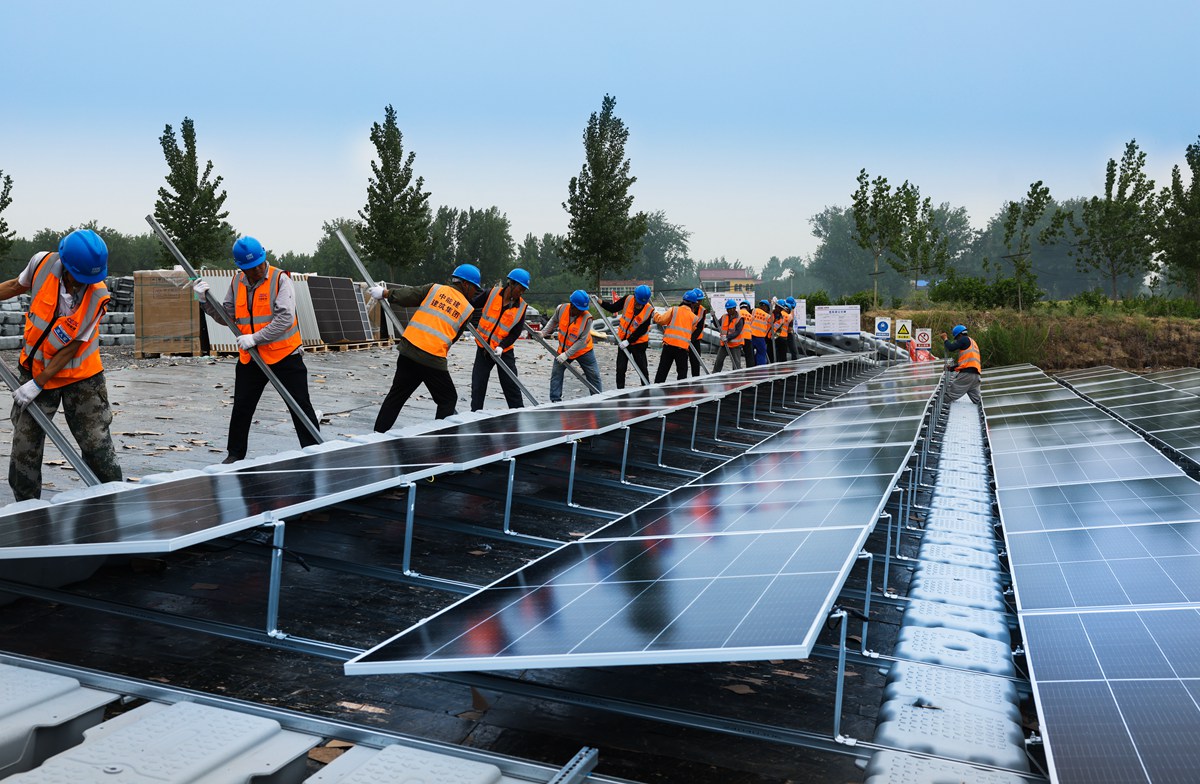 5月11日,電力分公司青東塌陷區水面光伏板正在組裝下水