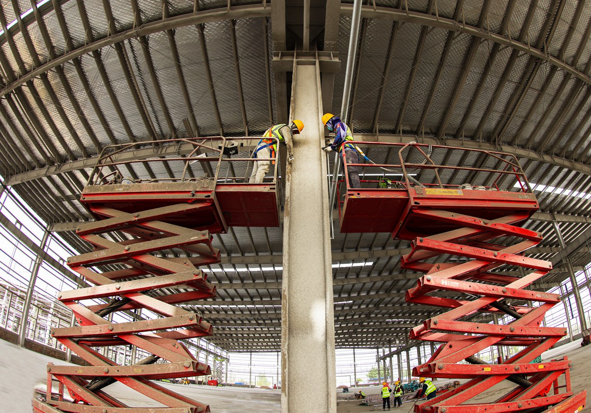 5月11日,工人借助升降車對廣聚物流園區廠房鋼結構進行防火涂層施工