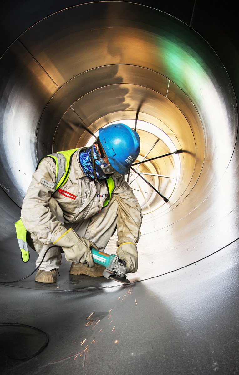 5月13日,在聚能發電公司施工現場,工人對循環水管焊縫進行拋光處理
