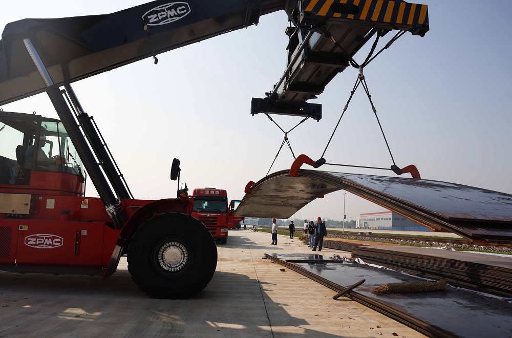 10月11日上午,淮北零碳智慧物流產(chǎn)業(yè)園大宗物資作業(yè)現(xiàn)場(chǎng),正面吊運(yùn)起重機(jī)正開(kāi)足馬力,將600噸16至25毫米厚度的大塊鋼板一次性吊起6至8塊,裝到排成長(zhǎng)隊(duì)的6軸大貨車上。