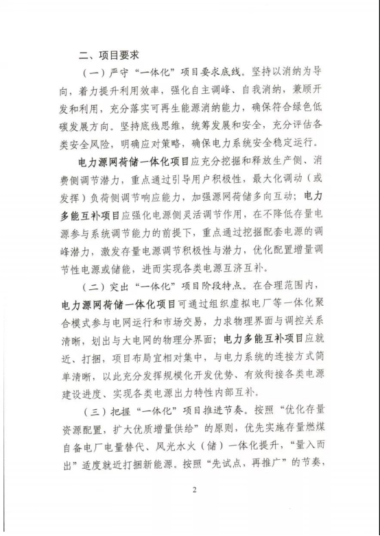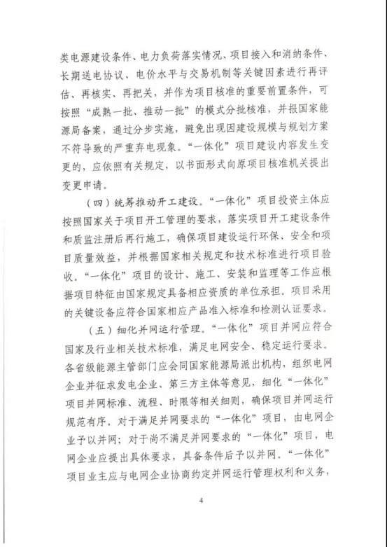 工作要求:積極開展方案論證??茖W有序評估納規。落實項目核準要求。統籌推動開工建設。細化并網運行管理。優先推進鄉村振興項目。鼓勵重大創新示范。在上述工作要求中,《通知》要求,各省級能源主管部門應開展“一體化”項目評估工作,與國家“十四五”可再生能源發展規劃充分銜接,逐項論證明確“一體化”項目立項條件、消納條件、建設規模、接入系統方案、配套電網工程等,在充分征求相關電力企業意見基礎上,于12月底前擇優納入本省(區、市)電力規劃。