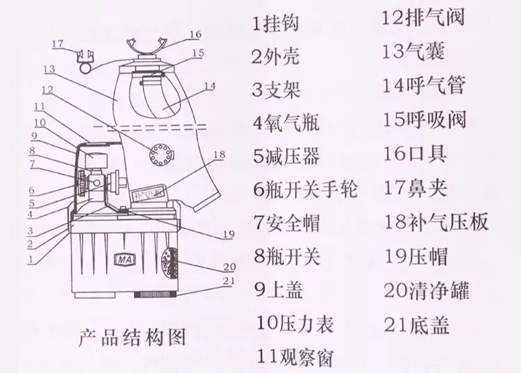 3、清凈罐內裝入定量的符合標準的CO2吸收劑形成CO2過濾系統。平時所有系統裝置都裝在殼體之中,使用者能通過上蓋上的觀察窗清楚地看到壓力表的壓力指示。在下殼上設有皮帶孔和背帶,使用者可固定在礦工皮帶上或挎在肩上。4、供氧方式有以下三種: