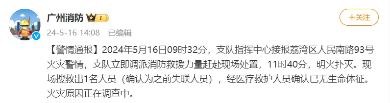 5月16日,廣東省廣州市荔灣區人民南路93號火災警情,據廣州市消防救援支隊消息,截至當日11時40分,明火已被撲滅。