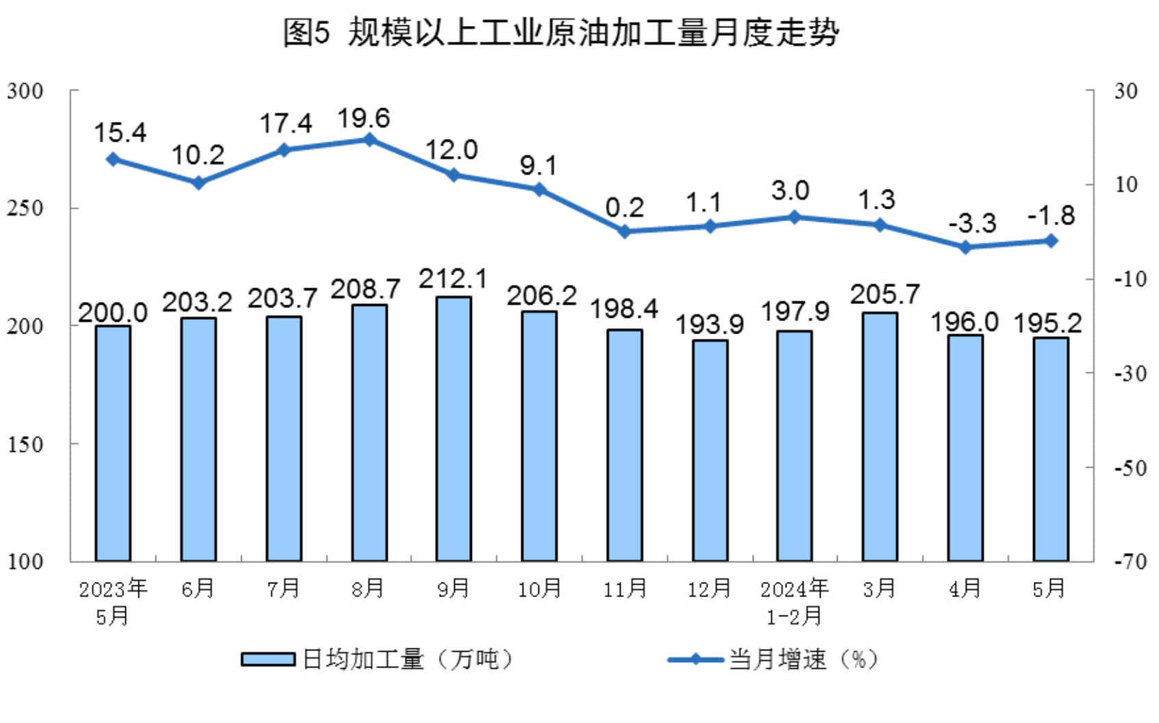 ?原油加工降幅收窄。5月份,規上工業原油加工量6052萬噸,同比下降1.8%,降幅比4月份收窄1.5個百分點;日均加工195.2萬噸。1-5月份,規上工業原油加工量30177萬噸,同比增長0.3%。